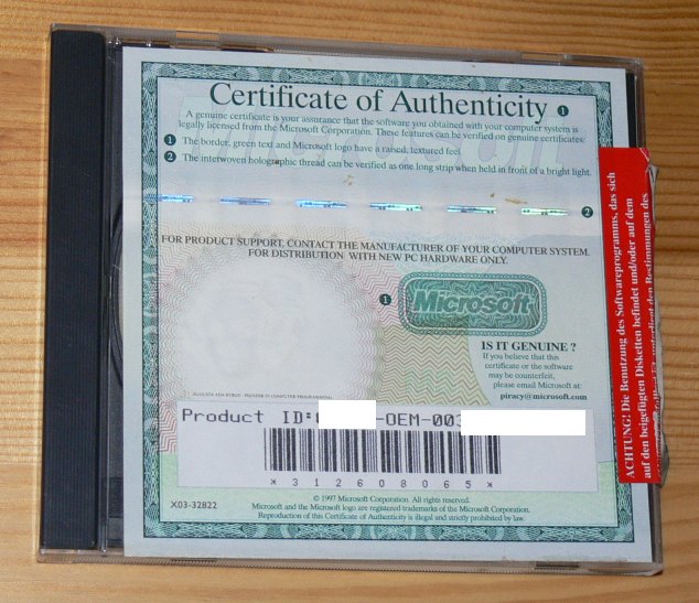 of Authenticity" dabei, einschließlich Product ID (auf dem
